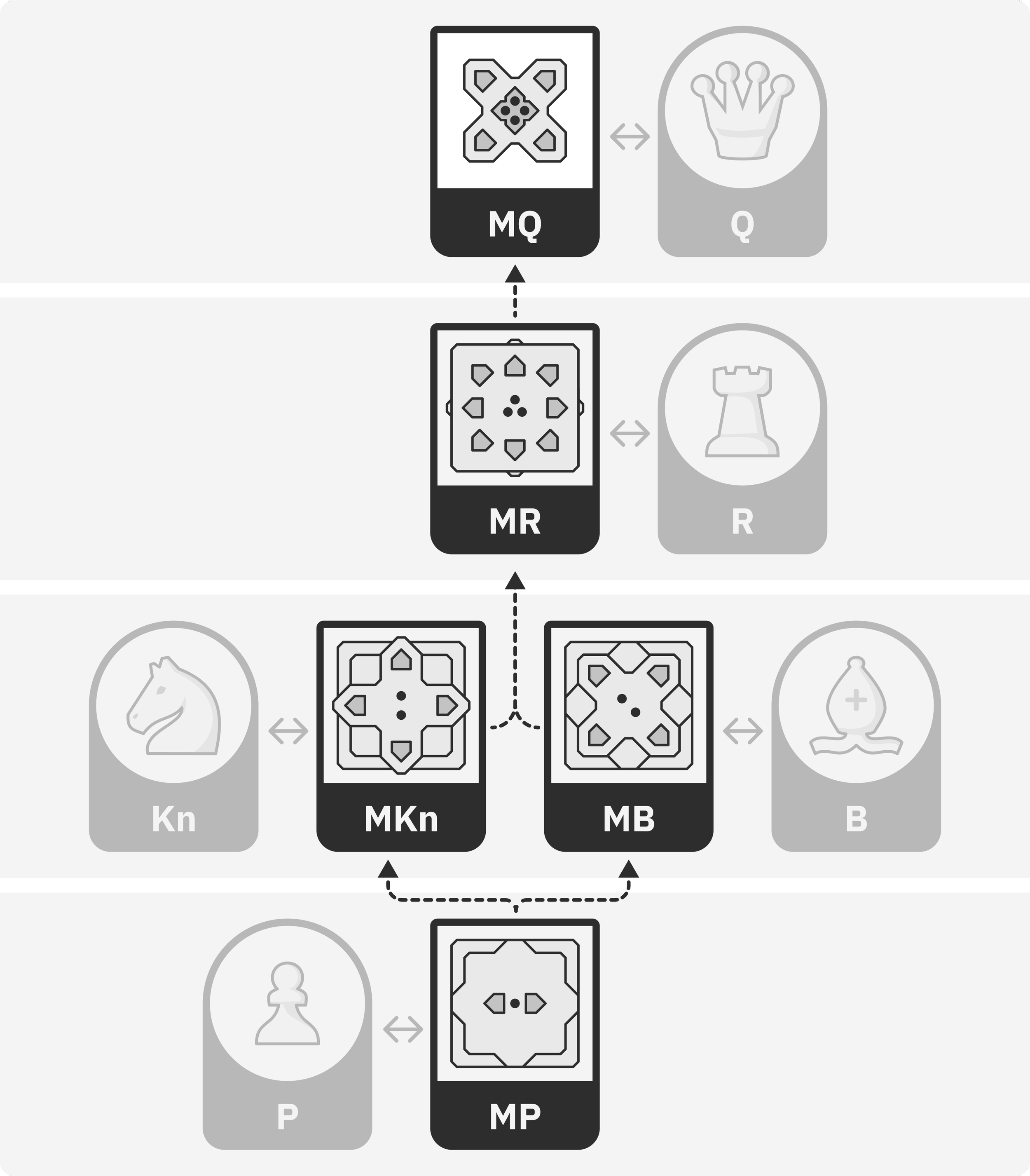Progress Learn Complete & Continue Next Lesson Learn More CONCEPT 1 Lesson π Principles FORMATION 1 Lesson π₯ New chess phase / How to introduce a Meta in the game? CONFIGURATIONS 6 Lessons π What are the different configurations of Metas? π₯ Meta-Pawn / How to replace a Pawn by a Meta? π₯ Meta-Knight / How to replace a Knight by a Meta? π₯ Meta-Bishop / How to replace a Bishop by a Meta? π₯ Meta-Rook / How to replace a Rook by a Meta? π₯ Meta-Queen / How to replace the Queen by a Meta? EVOLUTIONS 4 Lessons π Can Metas change during the game? π₯ Evolution 1 / How does the Meta-Pawn evolve? π₯ Evolution 2 / How does the Meta-Knight/Bishop evolve? π₯ Evolution 3 / How does the Meta-Rook evolve? SPECIAL MOVES 5 Lessons π Does a Meta have special moves? π₯ Pawn Double Step / Can a Meta jumping two squares like a pawn? π₯ En Passant / Can a Meta perform en passant? π₯ Meta-Bridge / Can a Meta copy another Meta? π₯ Meta-Mate / Can I mate with a Meta? PROMOTIONS 5 Lessons π Can a Meta be promoted ? π₯ Advancement Promotion / What if the Meta copies a piece and reach the last row? π₯ Propulsion Promotion / Can I throw a Meta on the last row? π₯ Charge Promotion / Can a Meta be promoted without moving? π₯ Dual Promotion / Can two pieces promote in the mean time? CASTLINGS 6 Lessons π Can a Meta Castle? π₯ GHF / Can I castle Kingside with a meta copying a Rook? π₯ EGH / Can I castle Kingside with a meta copying the King? π₯ CAD / Can I castle Queenside with a meta copying a Rook? π₯ ECB / Can I castle Queenside with a meta copying the King? π₯ Dual castling / Can I castle twice ? Learn Complete & Continue Next Lesson Learn More EVOLUTIONS π Can Metas change during the game?